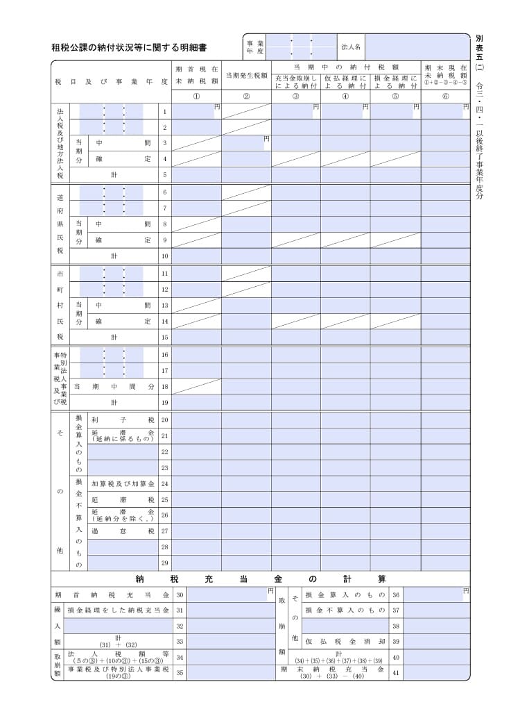 入力用PDF 別表五 二租税公課の納付状況等に関する明細書 令和3年4月1日以後終了事業年度分。