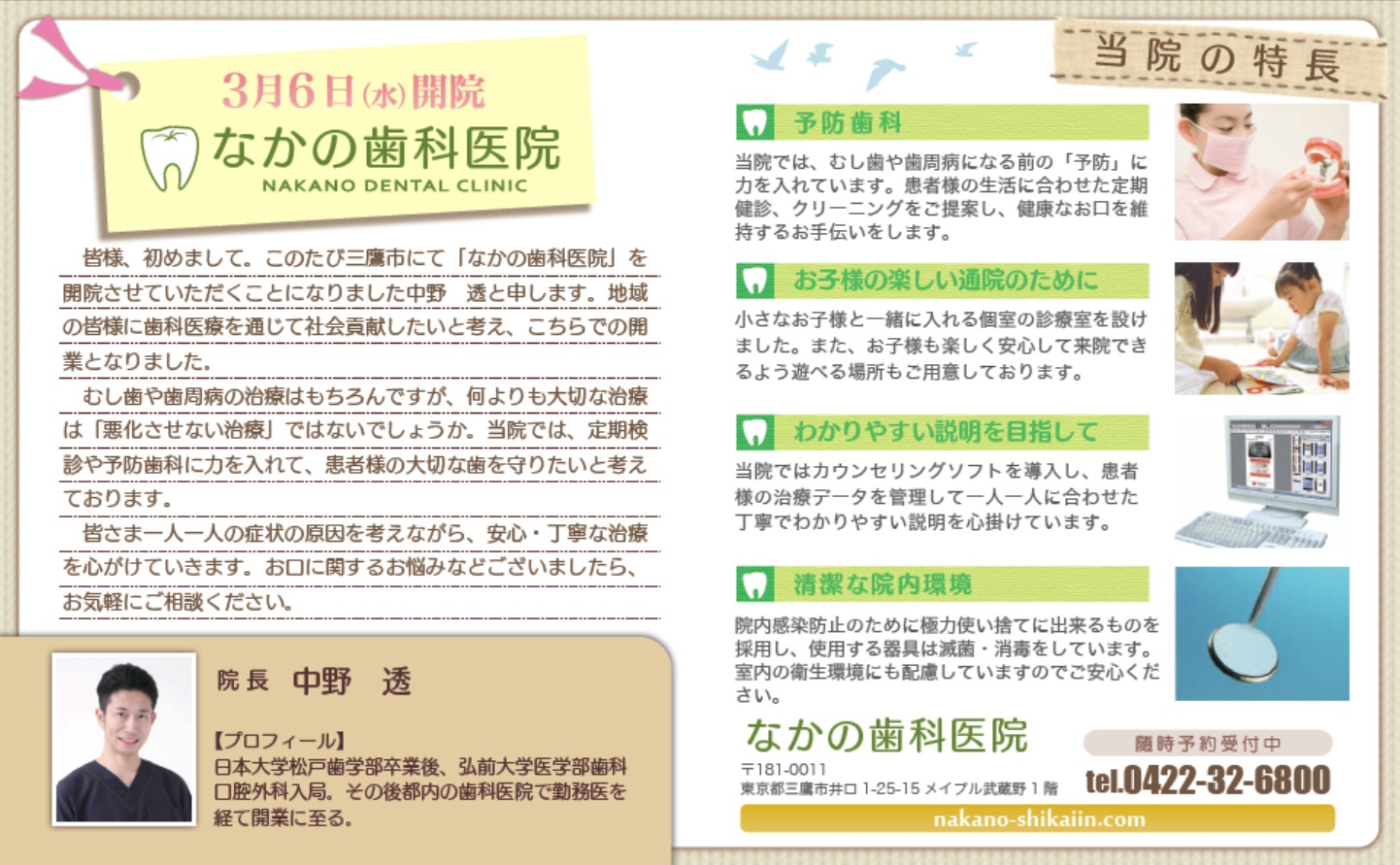 内覧会のチラシができましたなかの歯科医院 三鷹市 武蔵境駅近くの歯医者。