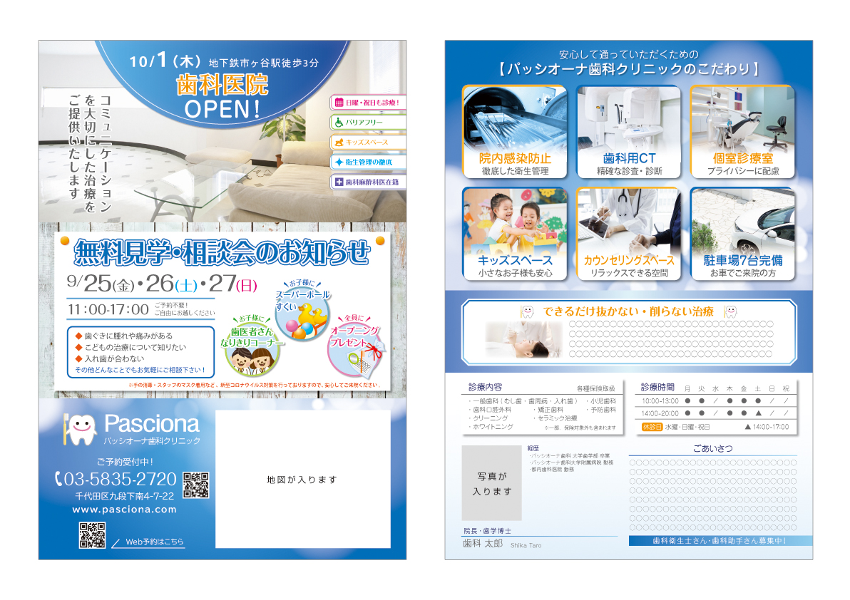 歯科開業チラシ・内覧会チラシ作ります 医院のイメージを大切に患者さんのハートにつながるデザインをココナラ。