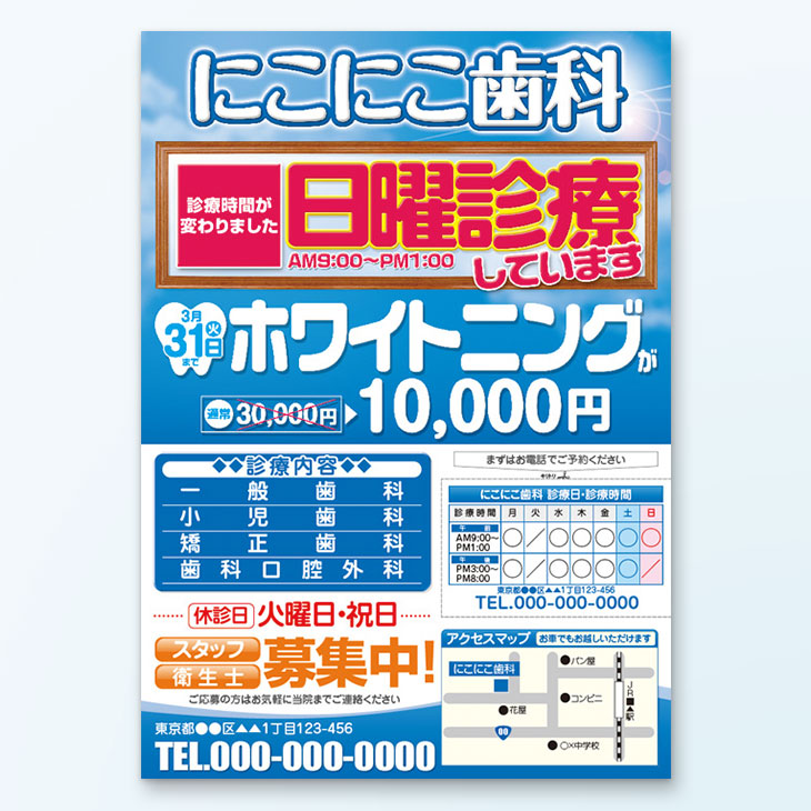 歯医者チラシデザイン事例日曜診療訴求、診療内容紹介チラシ作成専門 デザイン+印刷のCHIRASAKU チラサク。