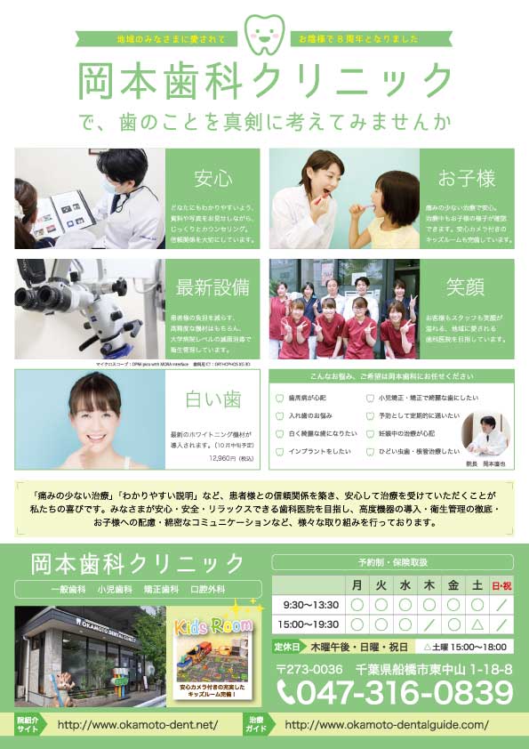 岡本歯科クリニック様「チラシ制作」成田市のホームページ制作 デザイン 印刷はアドミル。