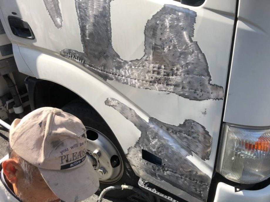 トラック鈑金修理、さらにハンマーで平らに整えてからパテ打ちをして研磨します。あと少しです。塗装と溶接基礎知識スタッフBLOG大阪の再生中古トラック専門店販売・買取トラック123。
