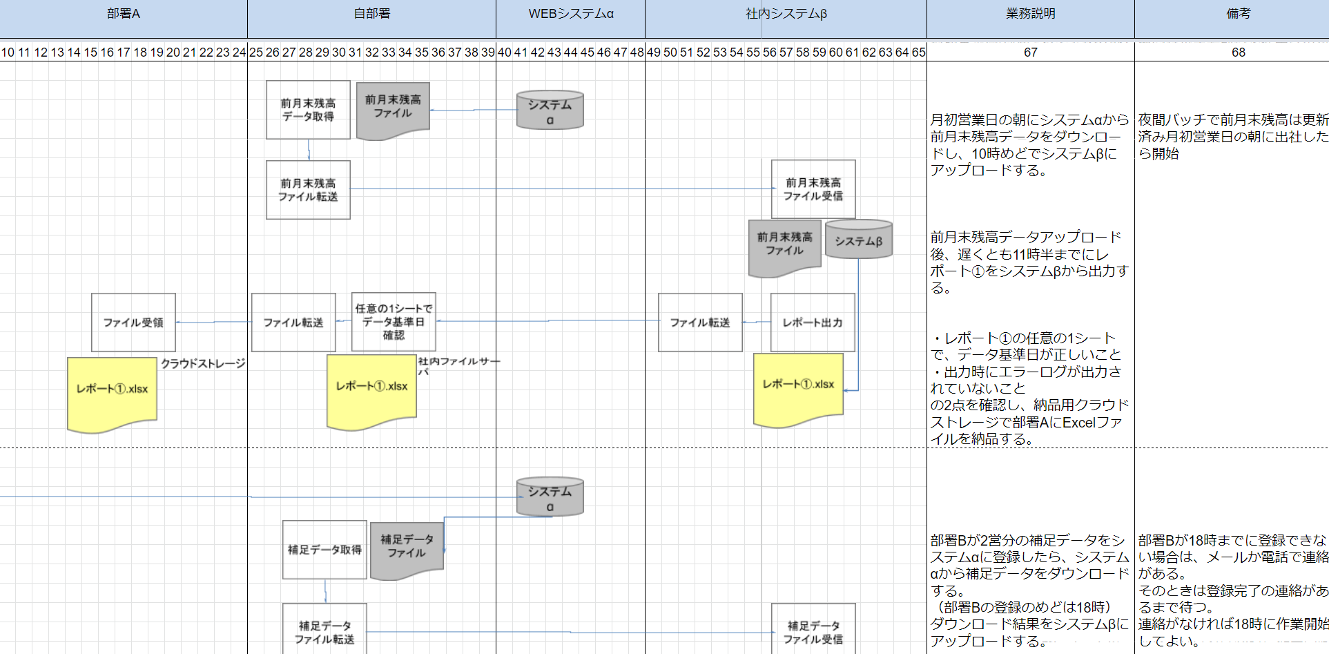 業務フロー図無料ExcelテンプレートA4・ヨコ・4列・サンプル付きプラスブログ。