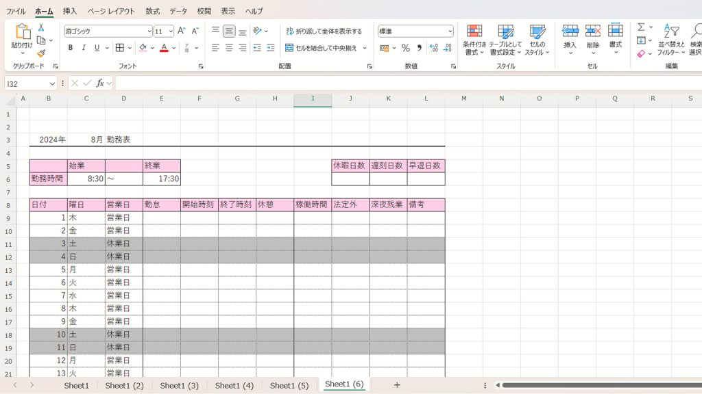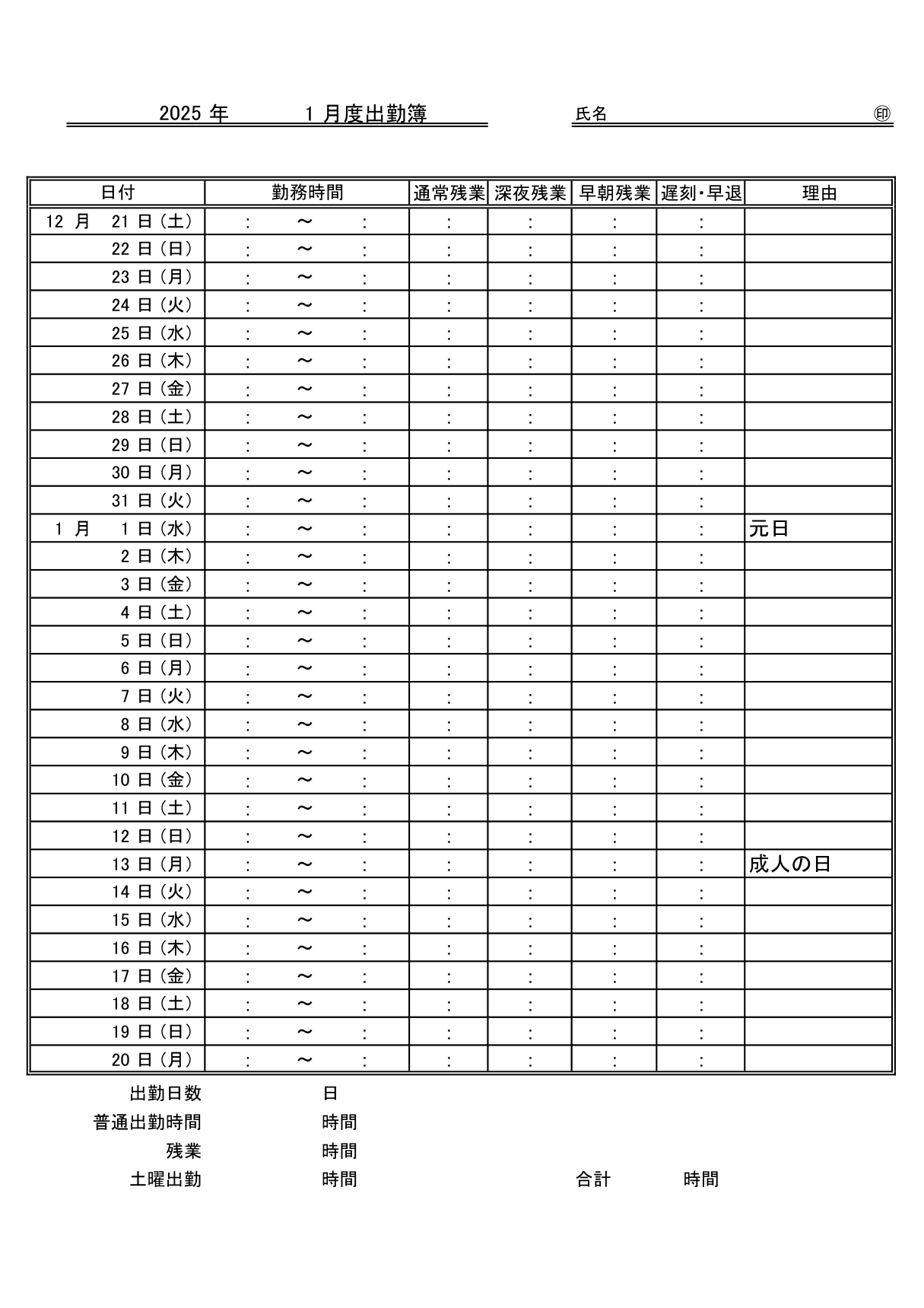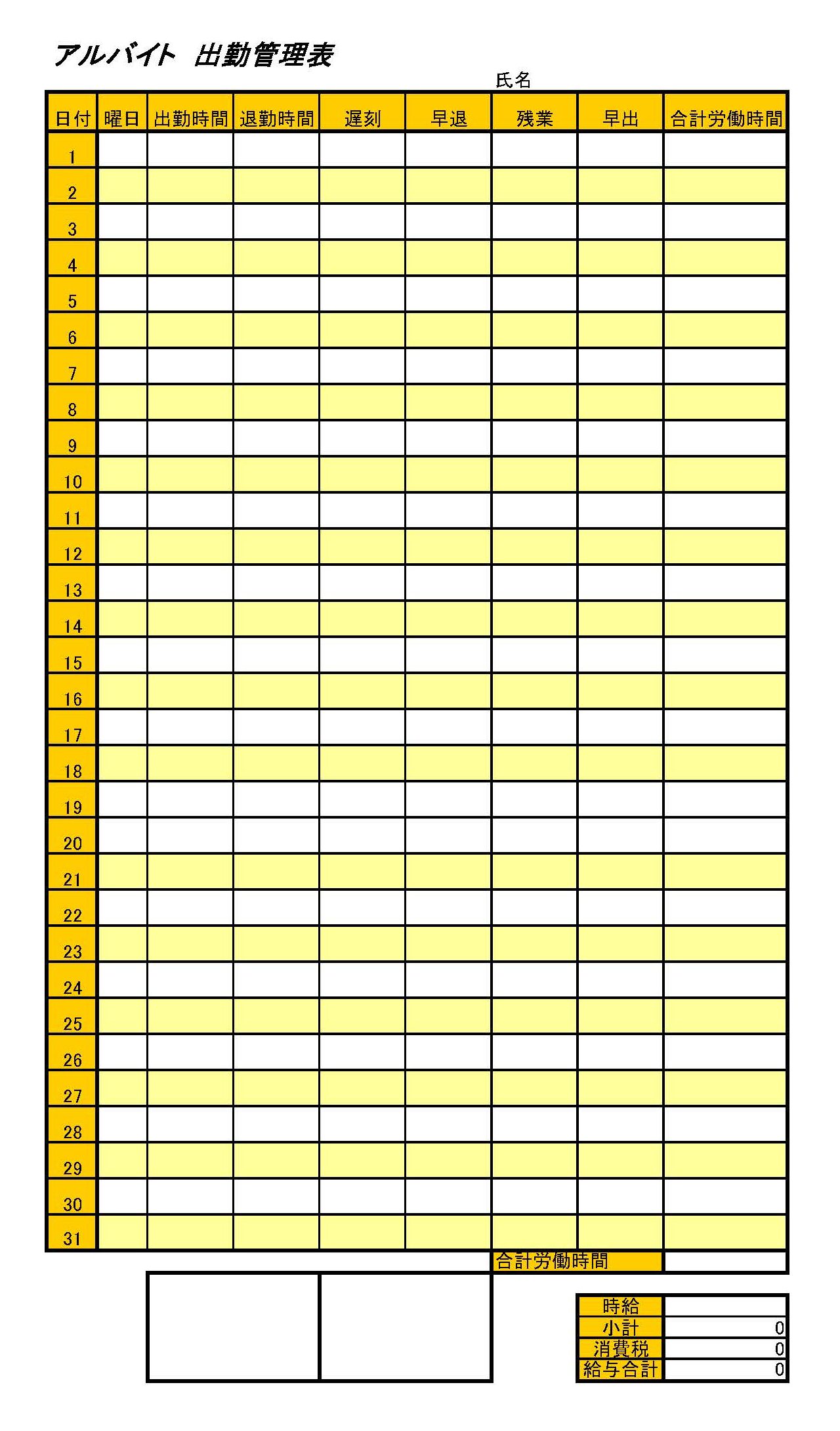 出勤管理表05のテンプレート・:Excel エクセルテンプレート・フリーBiz。
