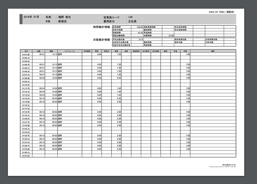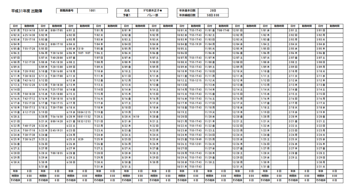 勤務データを出力する:PDF出力 – 勤怠管理システム『勤怠先生』オンラインマニュアル。