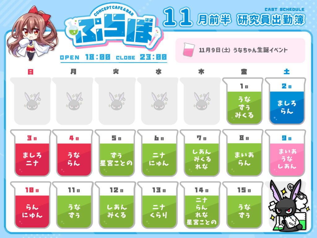 11月前半の出勤表コンセプトカフェ Pretty Labo ぷらぼ。