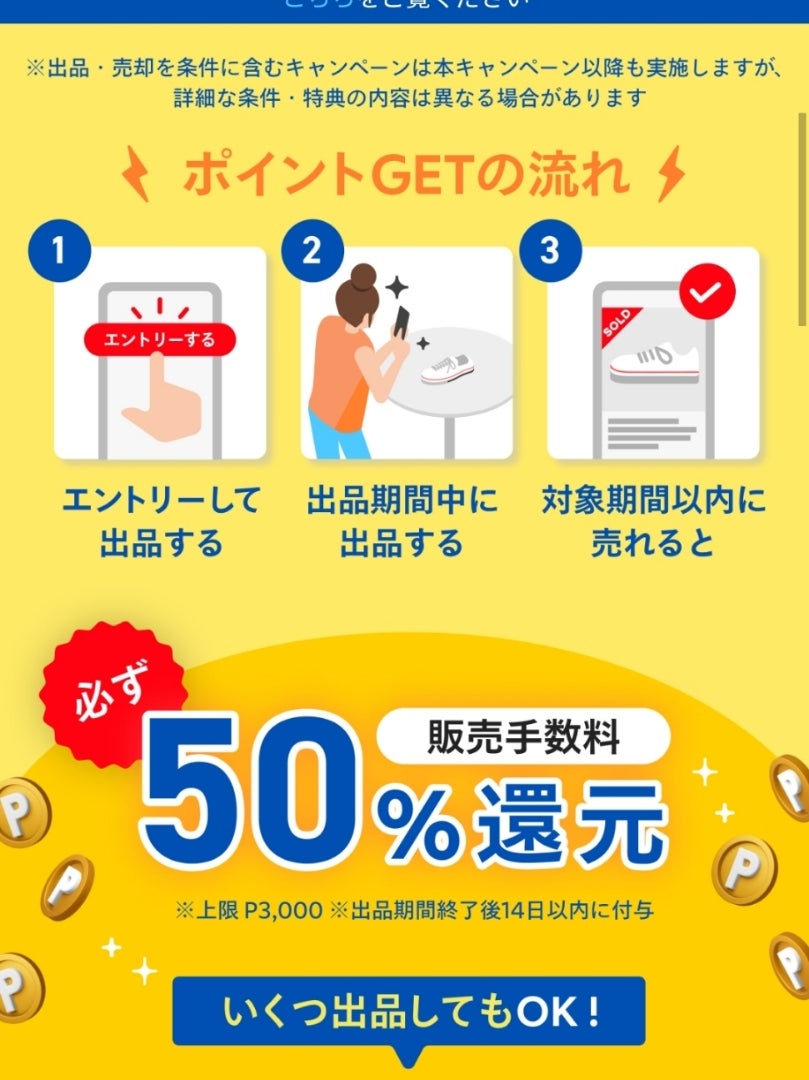 メルカリの50%還元キャンペーン 10時からですよ〜!メルカリに毒づくフリマ沼人、焼き芋の徒然。