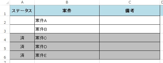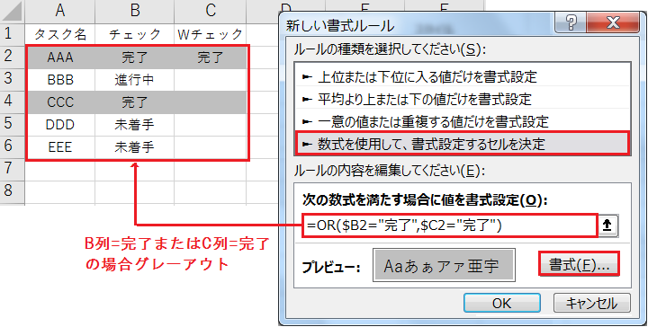 Excelで完了、済などの文字を入力したセルを条件付き書式でグレーアウトする - CAFE BREAK。