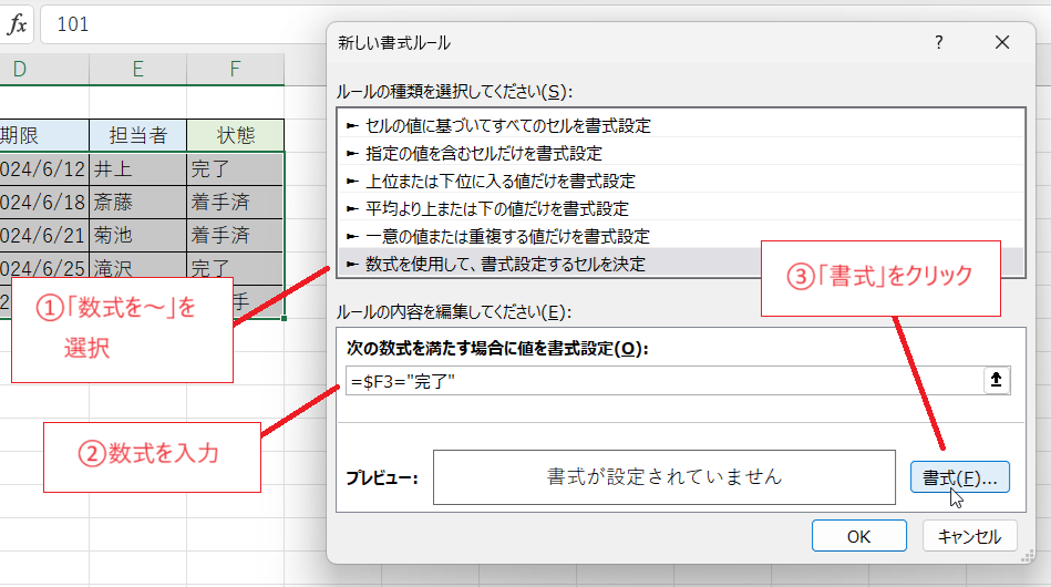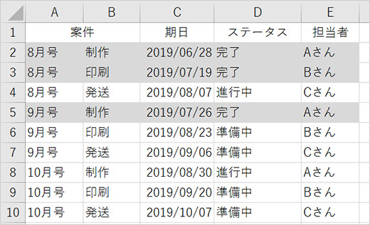 Excel エクセルで済や完了で色付け グレーアウト:行全体や列全体に自動で色変更 する方法モアイライフ more E life。