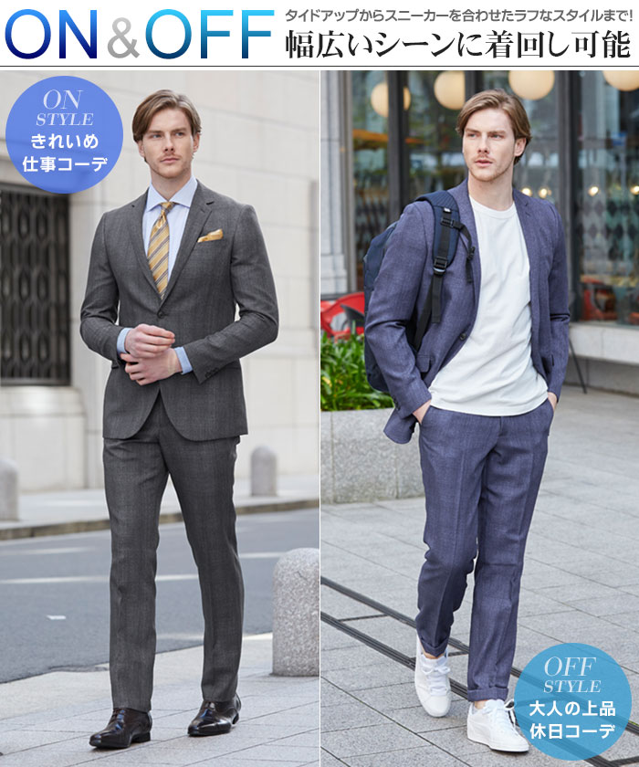 OUTLETデニム調スーツ メンズ 洗えるスーツ ビジネス カジュアルスーツ スリム おしゃれ デニム風 ウォッシャブルスーツ 春夏スリーシーズン 2つボタン 上下ウォッシャブル プリーツ加工 デニムスーツ セットアップ アクティブスーツスーツスタイルMARUTOMI。