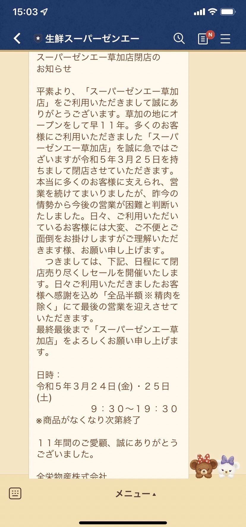 草加市 残念なお知らせが飛び込んできました。「スーパーゼンエー草加店」が閉店を発表。明日3月24日から半額セール。号外NET 草加市。