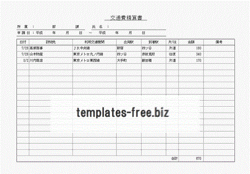 交通費立替精算書の書式テンプレート Excel・エクセルテンプレート・フリーBiz。