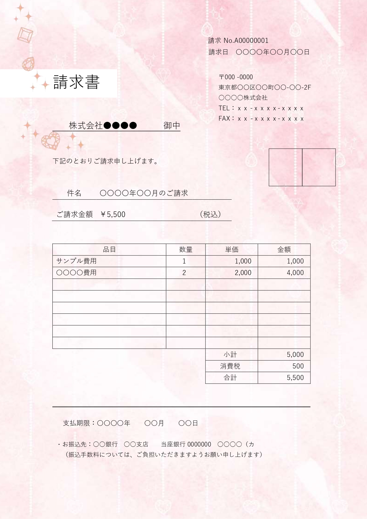 ピンク色の請求書テンプレート Excel・Word 書き方が分かる記入見本あり・個人宛、 イラストボックス「プレミアム」テンプレート。