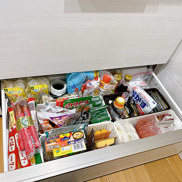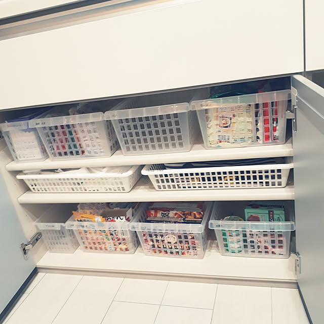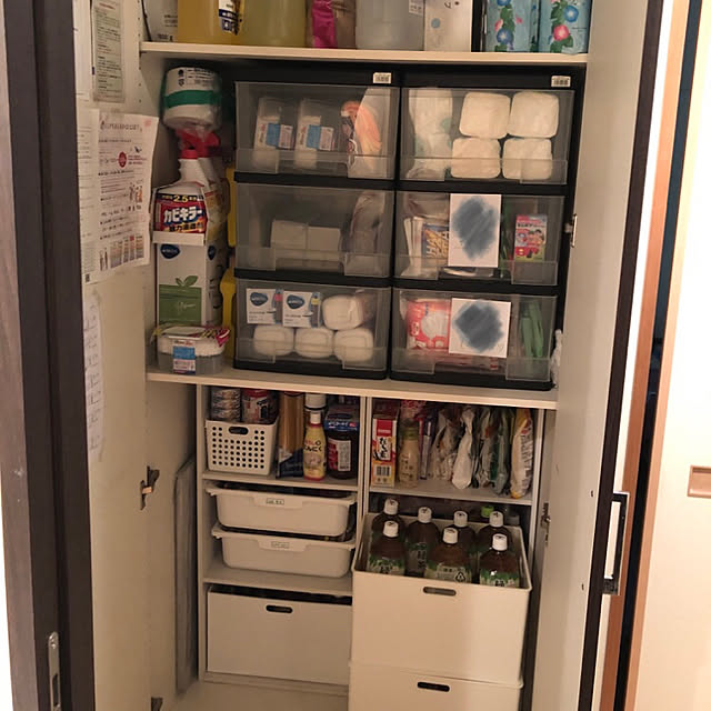 賃貸暮らしでも パントリーは作れる 古い賃貸暮らしの我が家 もちろん パントリーなどございません そこで リビングにある開き戸の収納を パントリー代わりに使ってます収納グッズは ほぼニトリです 食品、消耗品ストック 文具、掃除用品、 通帳、印鑑、保険証券関係 薬。