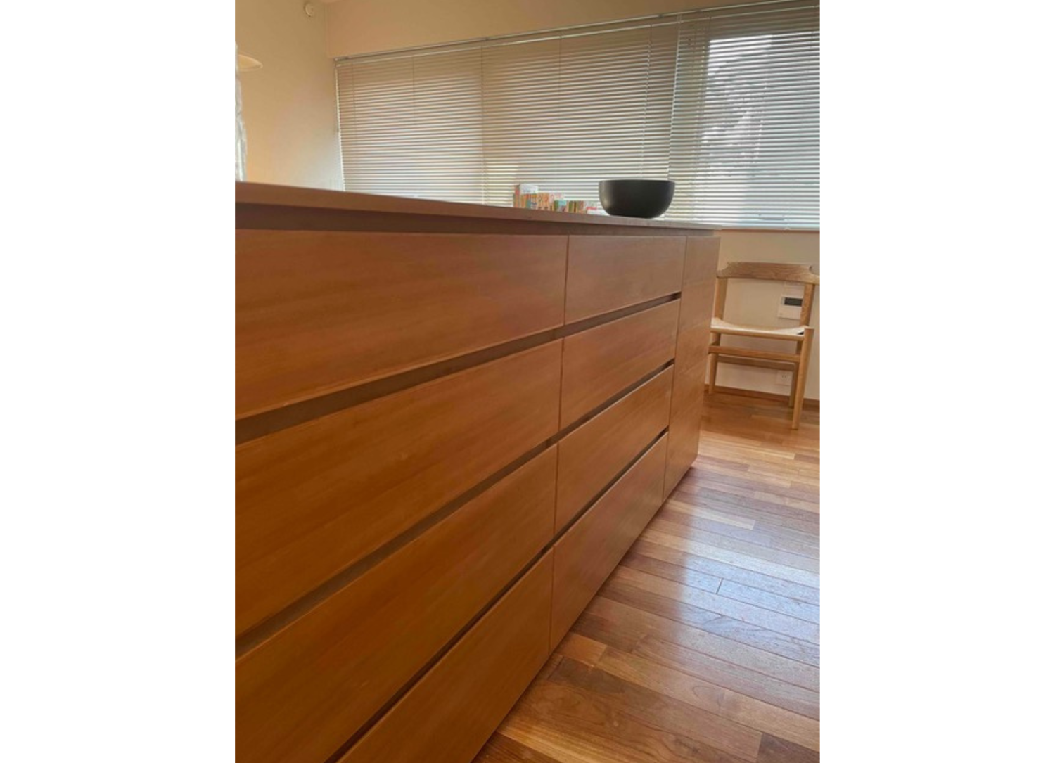 パントリーの代わりに、収納力のあるカップボードをオーダーメイドで製作。床やダイニングと同じ樹種でコーディネートされている くふうイエタテ。