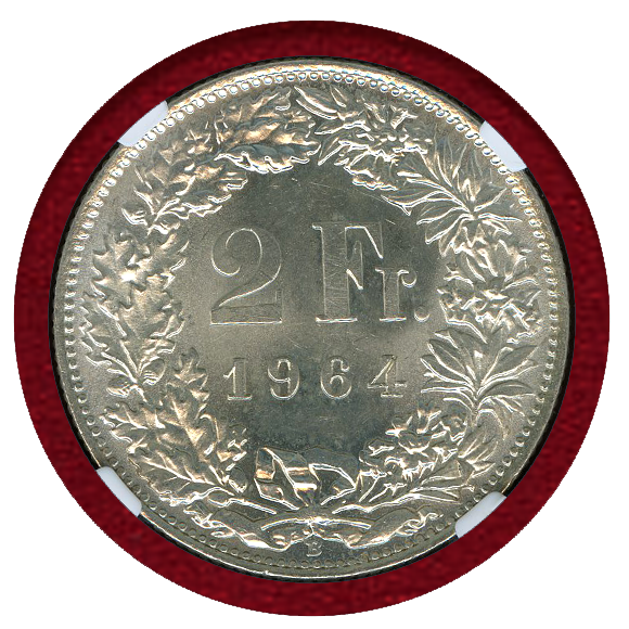 JCCジャパンコインキャビネットスイス 1964B 2フラン 銀貨 ヘルベティア立像 NGC MS64。