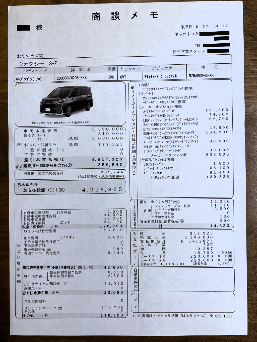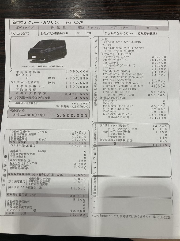 新型ヴォクシーS-Z、S-Gの見積書を公開!値引き込みの乗り出し価格は?くるまはっく。
