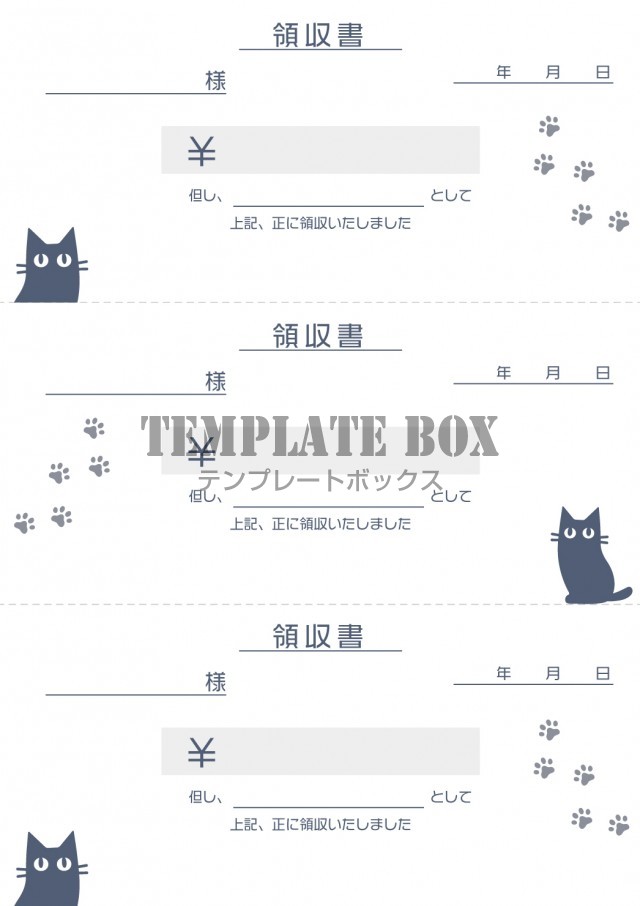 シンプルでかわいい猫の領収書テンプレート・3枚・A4サイズ・お店・フリマ A4サイズのJPG、透過PNG、PDF無料テンプレートTemplateBox。