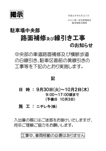 2月20・27日 土 9時~15時 立体駐車場の部品交換工事のお知らせ。