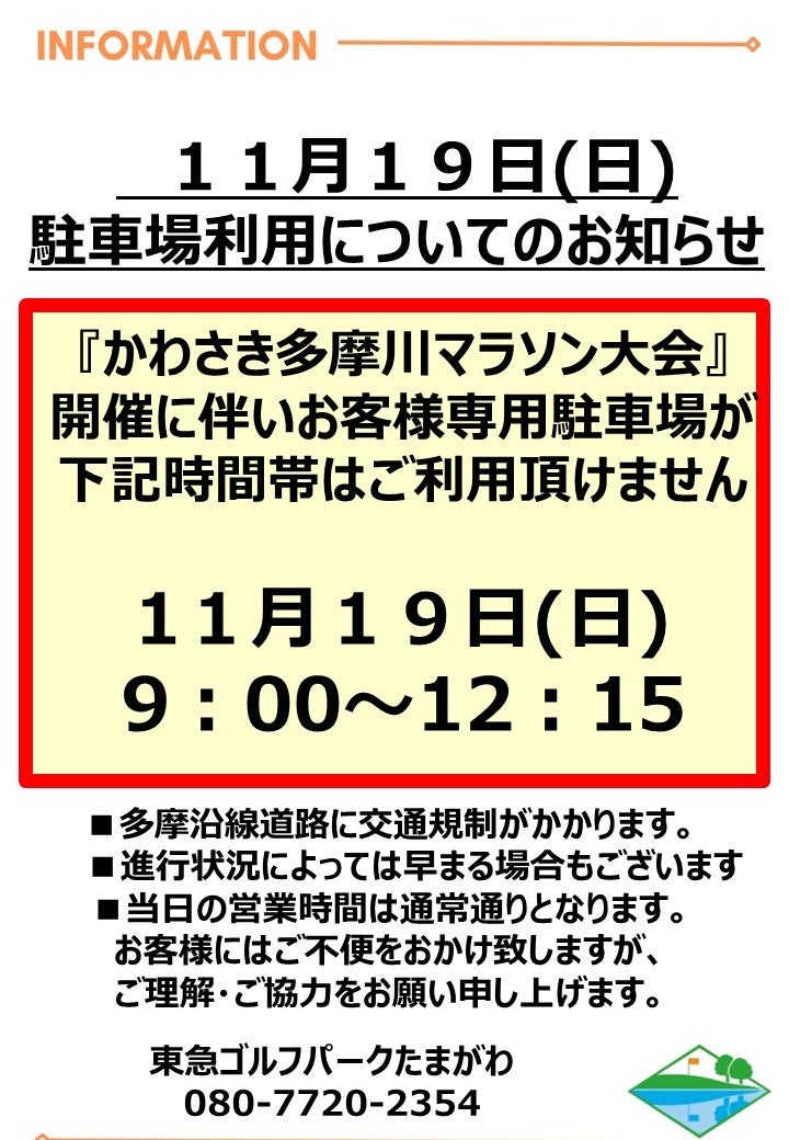 11月19日 日 かわさき多摩川マラソンに伴う駐車場利用制限について東急ゴルフパークたまがわ スタッフブログ。