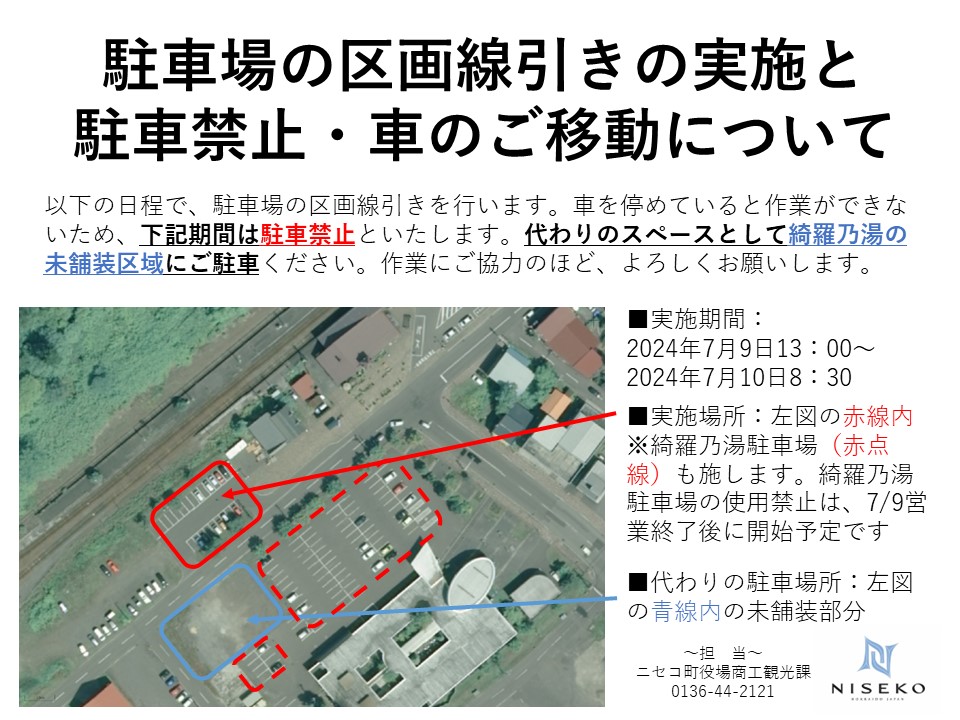 strong> 駐車場ご利用の方はご注意ください < strong> 7月9日~10日 JRニセコ駅横 駐車場 の区画線引の実施・駐車禁止につきましてお知らせニセコリゾート観光協会。