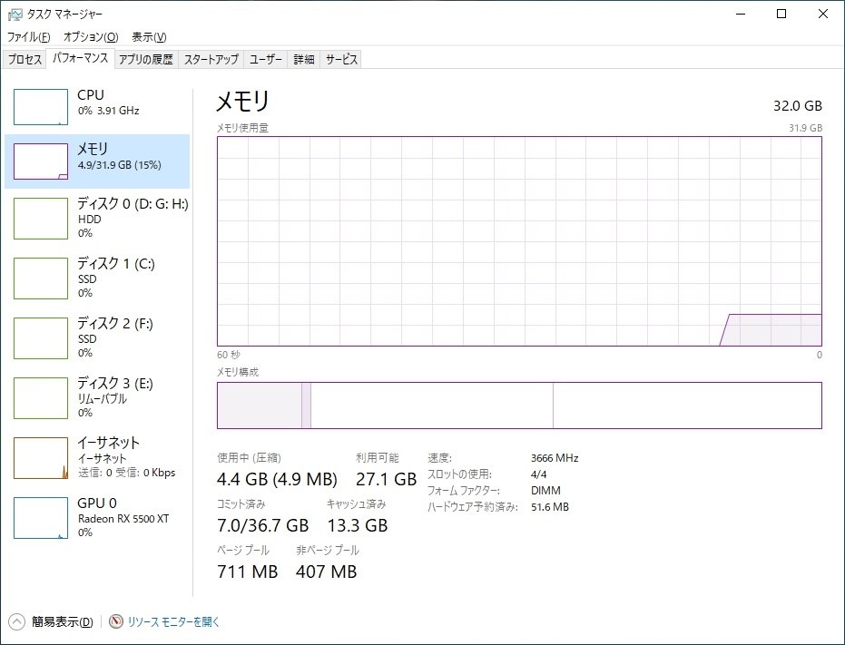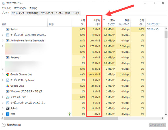 Windows10 – 何もしていないのにメモリ使用率がおかしい 高い時の対処。