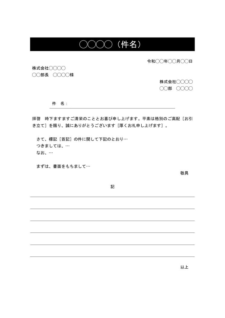ビジネス文書の書き方・例文・文例 書式・フォーマット 雛形 ひな形テンプレート 基本形デザイン性ありサブタイトルありワードWord 12 件名に網かけ①別記が罫線形式-文書 テンプレートの無料ダウンロード。