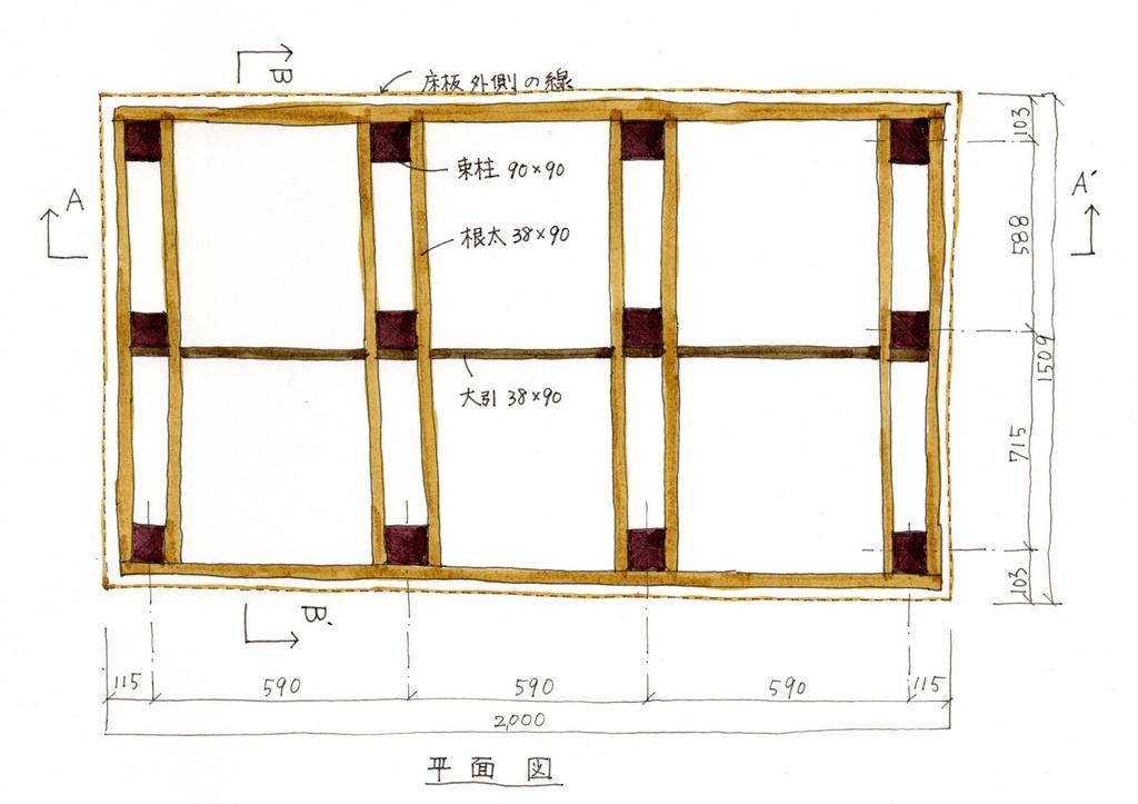 ウッドデッキの作り方。土台の構造 束柱・根太 と作り方とは?tiny-cabin-woodworks。