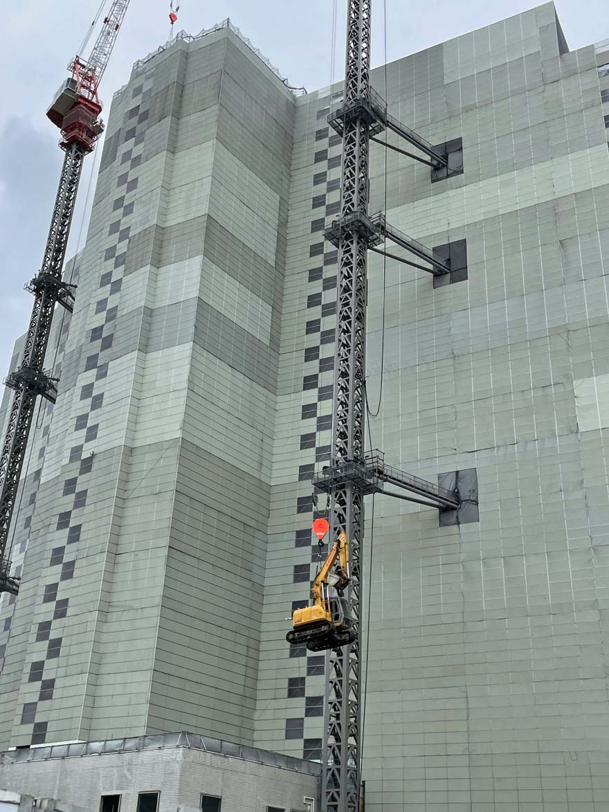 40mのマンション屋上にユンボの吊り上げ作業を実施。 ┃ ラフテレーンクレーン オールテレーンクレーンの作業・手配は丸良興業にお任せください。