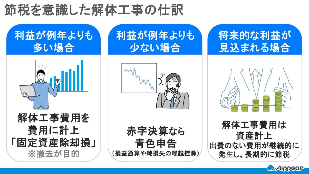 解体工事の勘定科目や仕訳を解説!節税対策もご紹介アイピア。