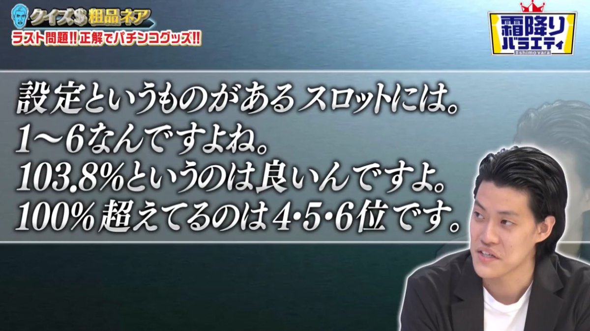 粗品 霜降り明星on X: "地上波で「ゴーゴージャグラー2の103.8%の出玉率の設定は?」というクイズが出る番組「霜降りバラエティ」https:t.co utoEGsNH4Z"X。