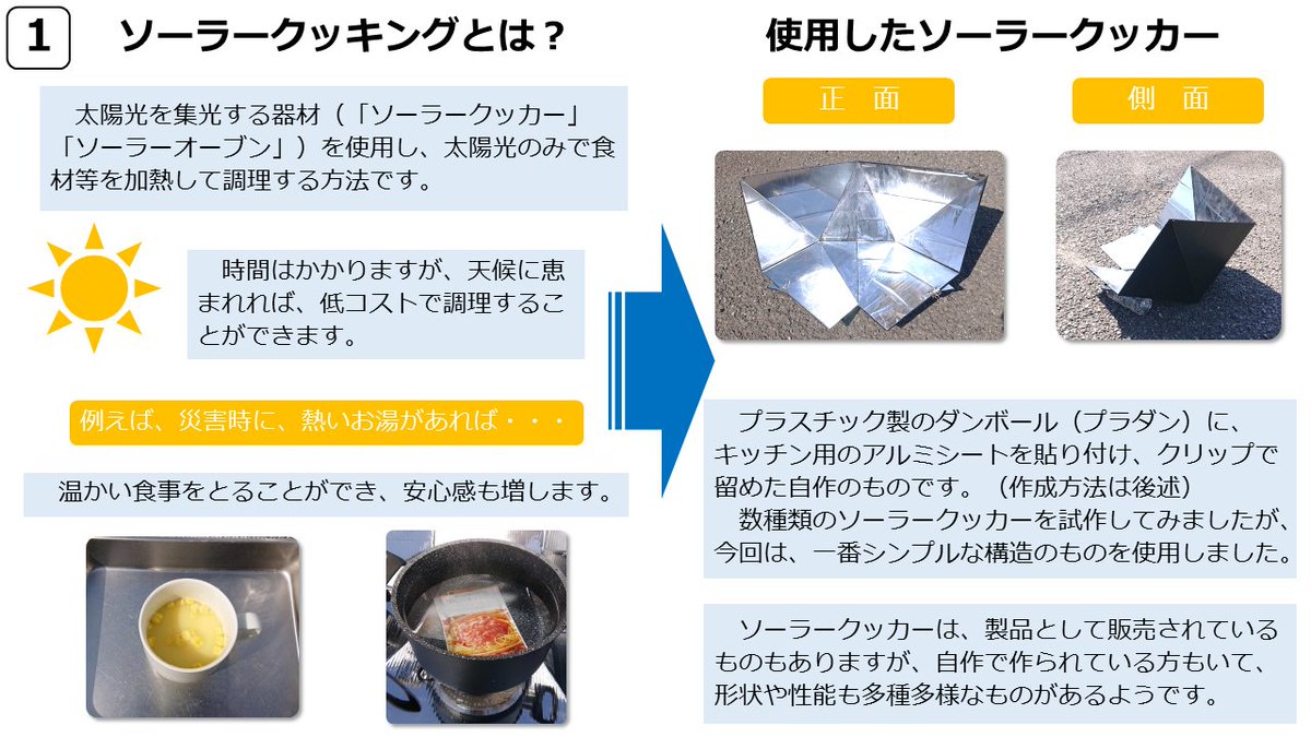 警視庁警備部災害対策課 on X: "災害時に、無限のエネルギー源である太陽光を活用できないかと思い、太陽光を集めて調理する「ソーラークッキング」にチャレンジしてみました。太陽光で水の温度を上げ、カップ麺をつくってみましたので、その手順等をご紹介します。詳細や。