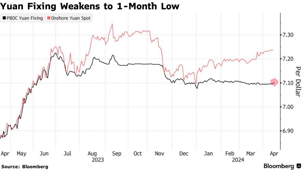 中国人民元の中心レート、2023年以来の元安水準に-通貨安容認か - Bloomberg。