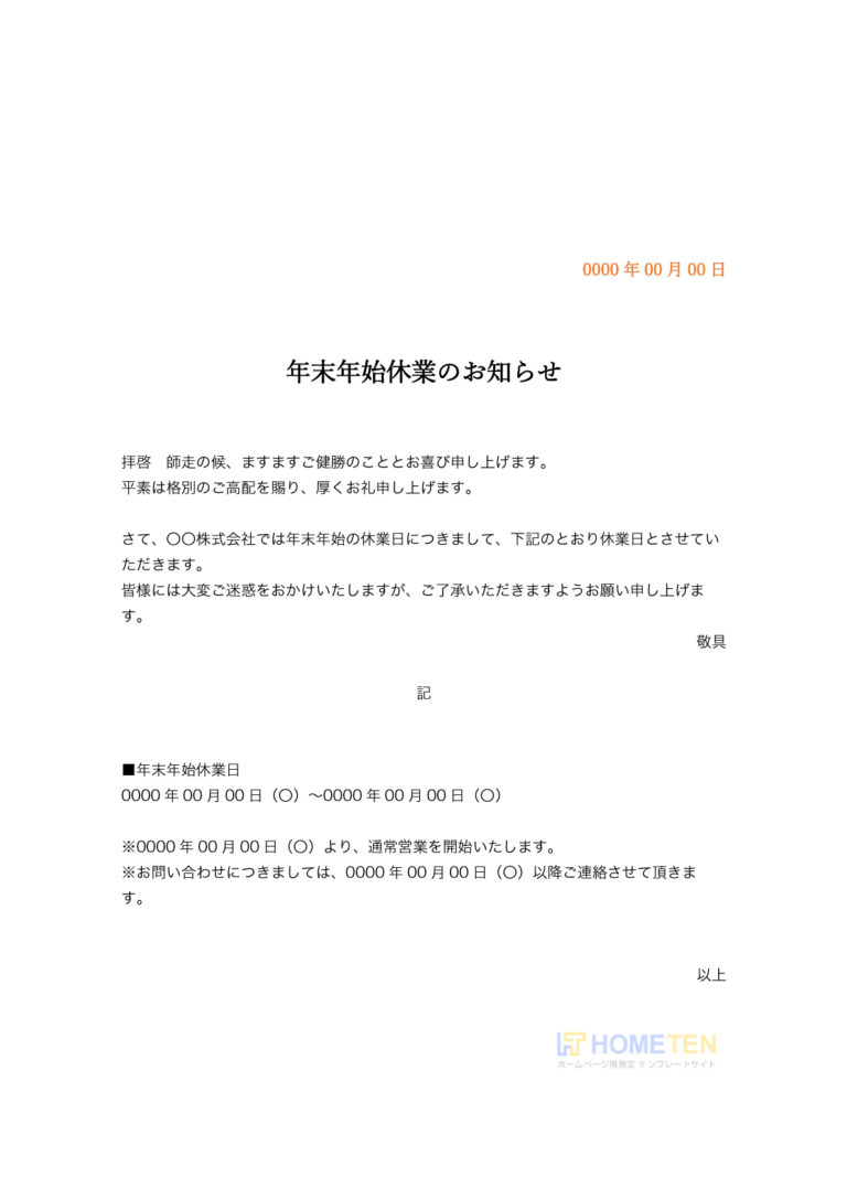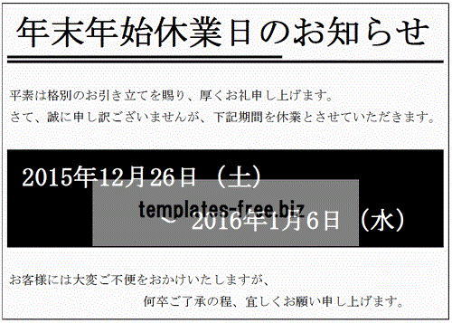通知 年末年始休業:ハガキ の書式テンプレート Word・ワードテンプレート・フリーBiz。