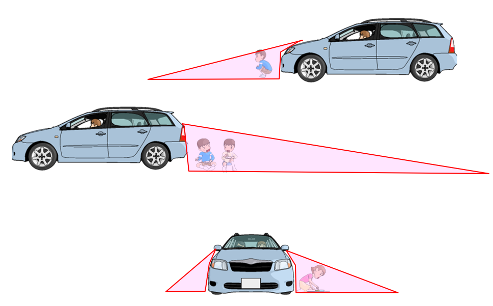 車の死角は以下のようによく言われますが 4月は、新社会人や新一年生の通勤通学 お花見にいくおじいちゃん、おばあちゃん などなど危険がいっぱいなので、サンデードライバー以外も気をつけましょう。
