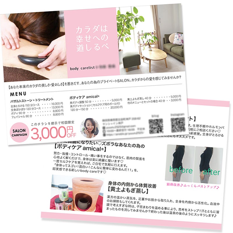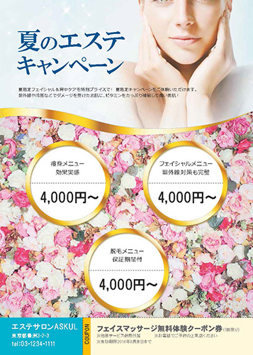 クーポンチラシ サロン集客に割引チラシ・クーポン付きチラシ・フライヤー作成美容チラシ リーフレット・パンフレット作成-エステ・ネイル・クリニック・ヘアサロン。