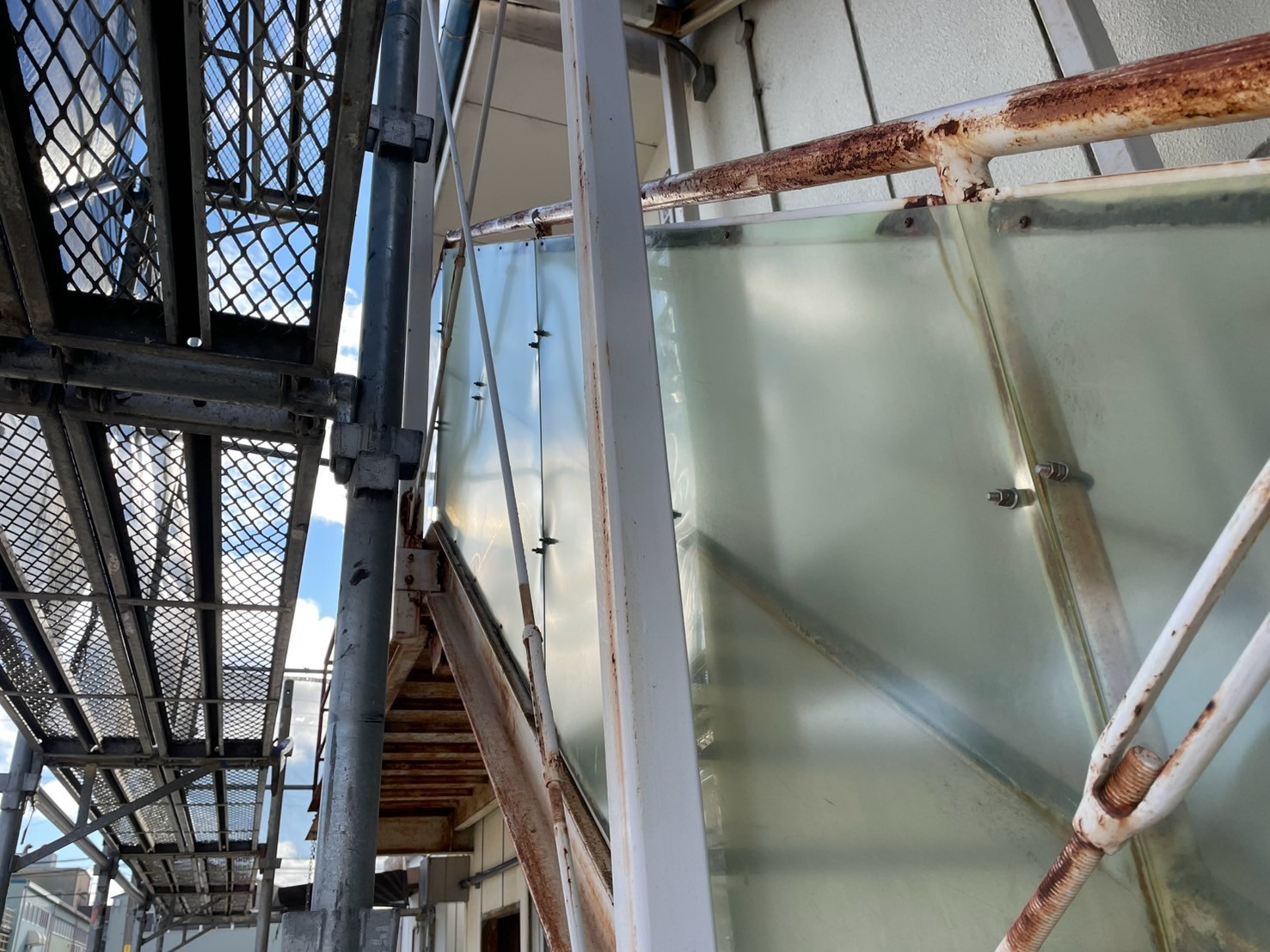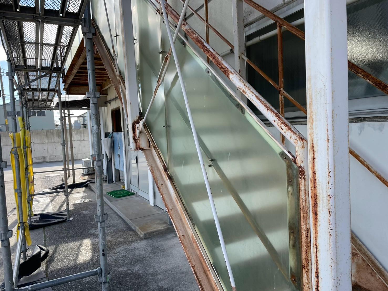 名古屋市港区にて屋外階段の錆びた鉄骨階段と折板屋根の塗り替え工事前の様子名古屋市で外壁の塗り替え・外装リフォームなら街の外壁塗装やさんへ。