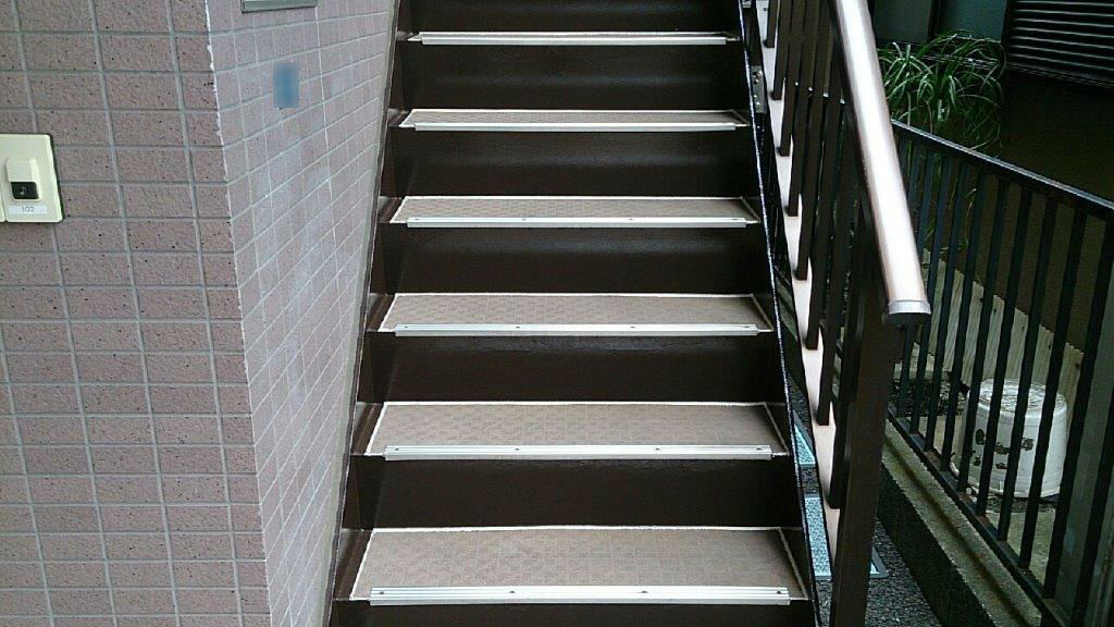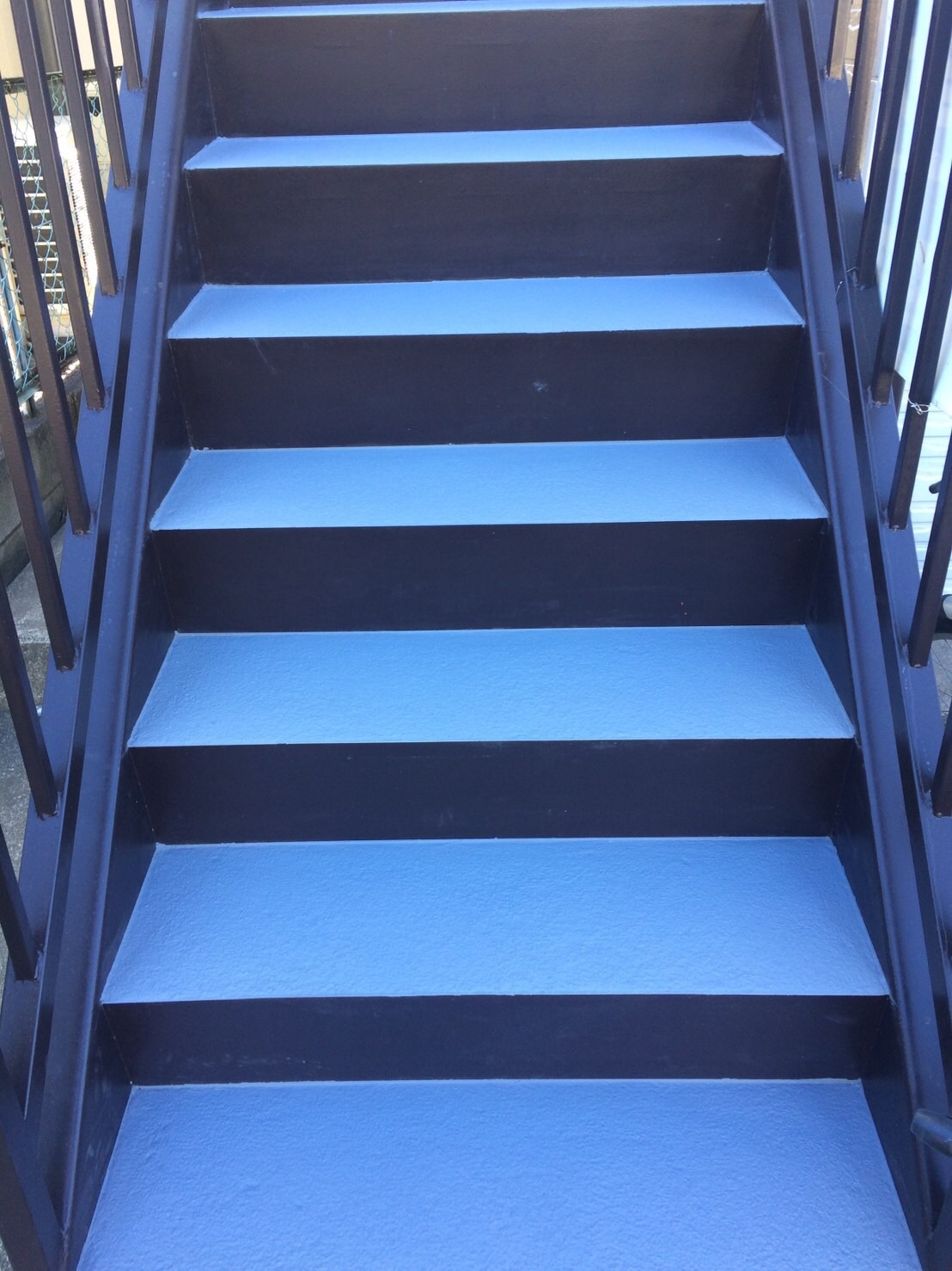 マンションの外部階段に錆止めとフッ素塗装、ノンスリップシート貼り :施工事例姫路市の外壁塗装・屋根リフォームならハウスレンジャーヒラヤマ。
