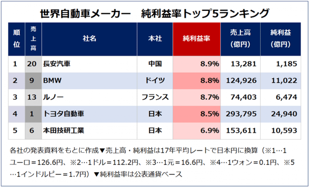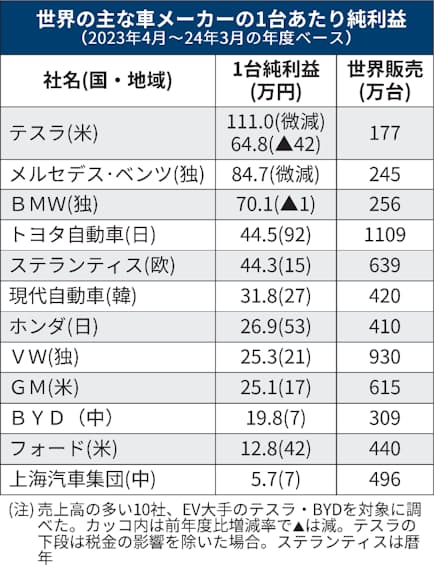 車メーカーの1台利益、テスラ首位 トヨタ・ホンダなど日本勢は伸び率上位 - 日本経済新聞。