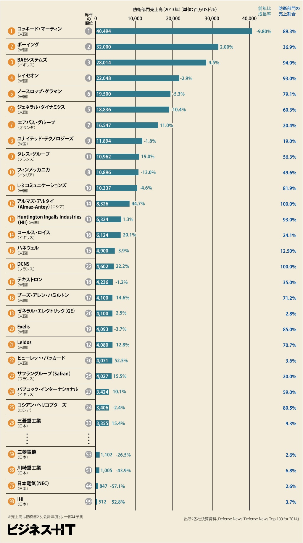 防衛・軍事産業の世界ランキング:サイバーセキュリティでM&A進めるロッキードやBAE 武器輸出三原則見直しが三菱重工に与える影響は?ビジネス+IT。