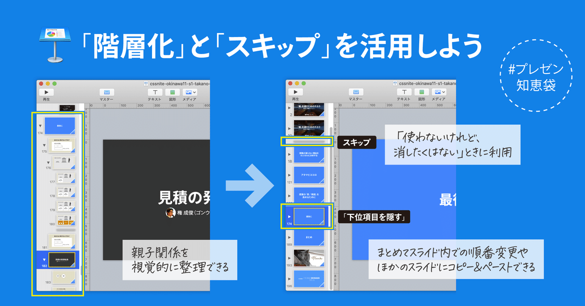 Keynoteユーザーなら、 スライドの「階層化」と「スキップ」を活用しよう鷹野 雅弘。