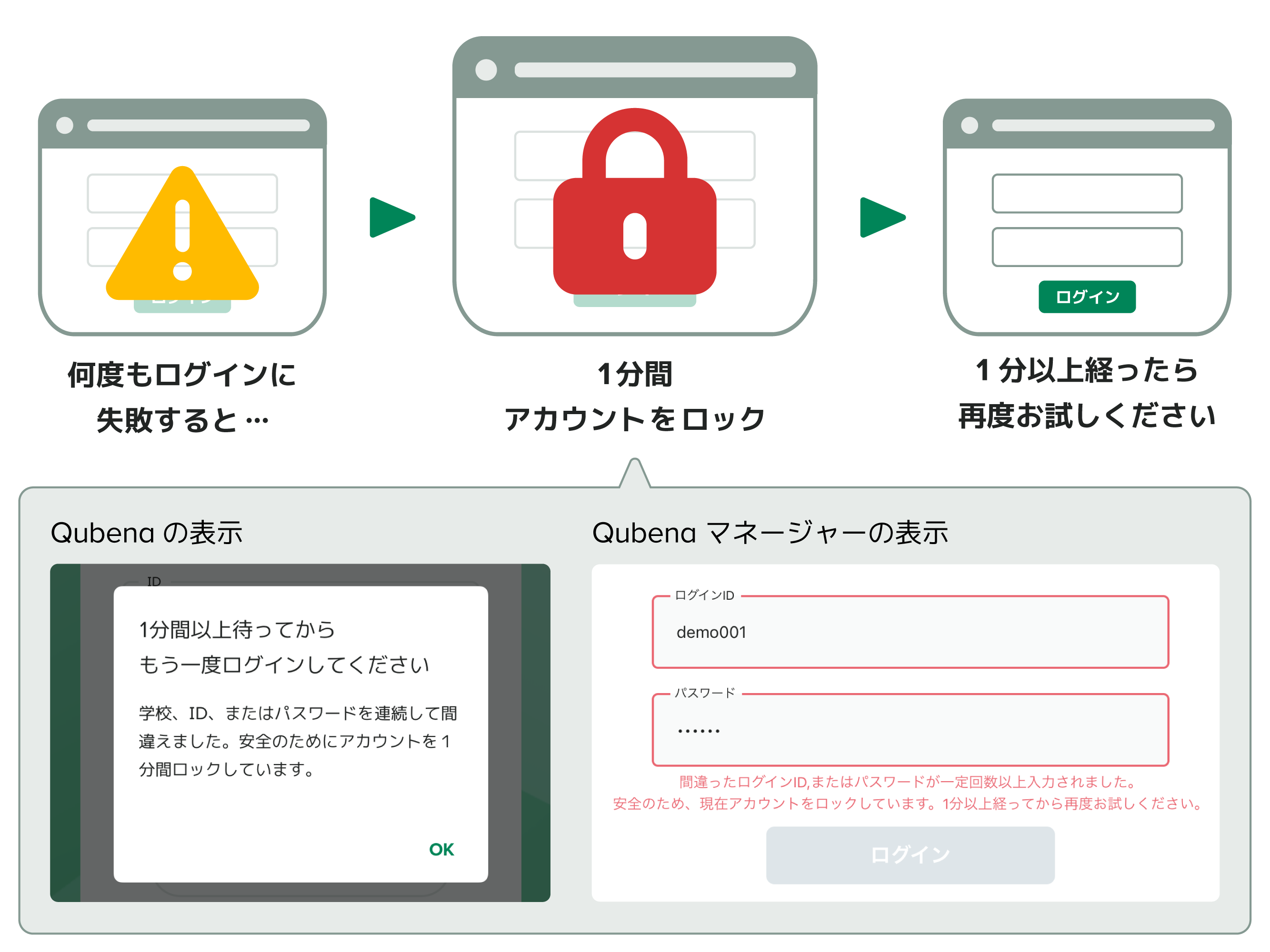ログインIDやパスワードを一定回数間違えて入力すると、安全のために1分間アカウントがロックされるようになりましたQubena活用ナビ Qubena-Navi キュビナビ。