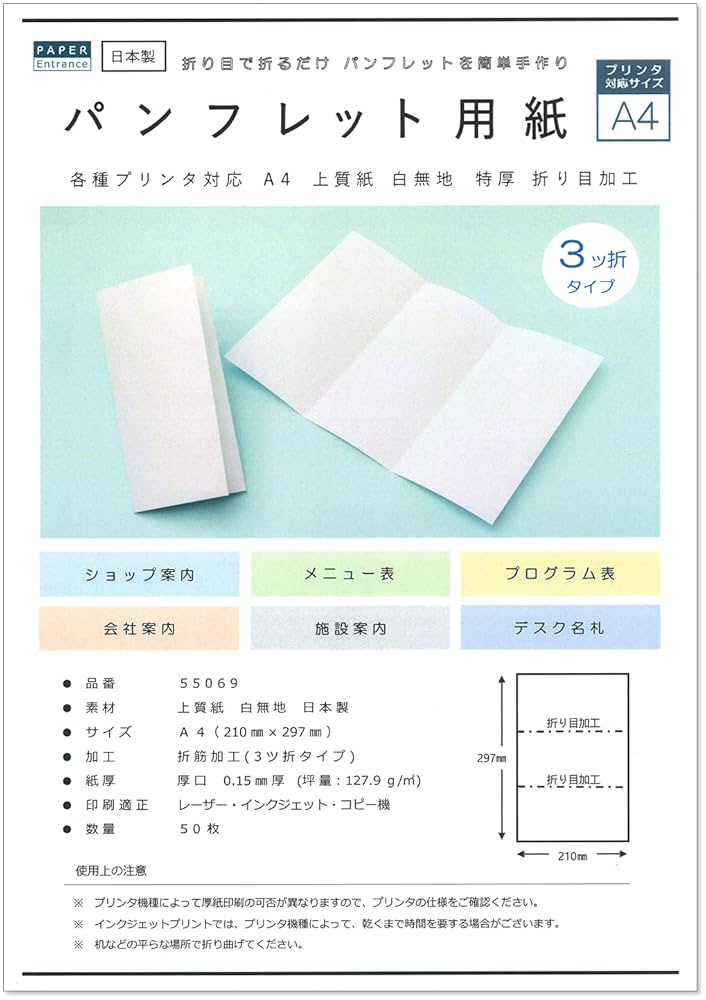 Amazonペーパーエントランス パンフレット用紙 A4 三つ折り 50枚 メニュー 案内状 手作り プリントペーパー 55069コピー用紙・印刷用紙文房具・オフィス用品。