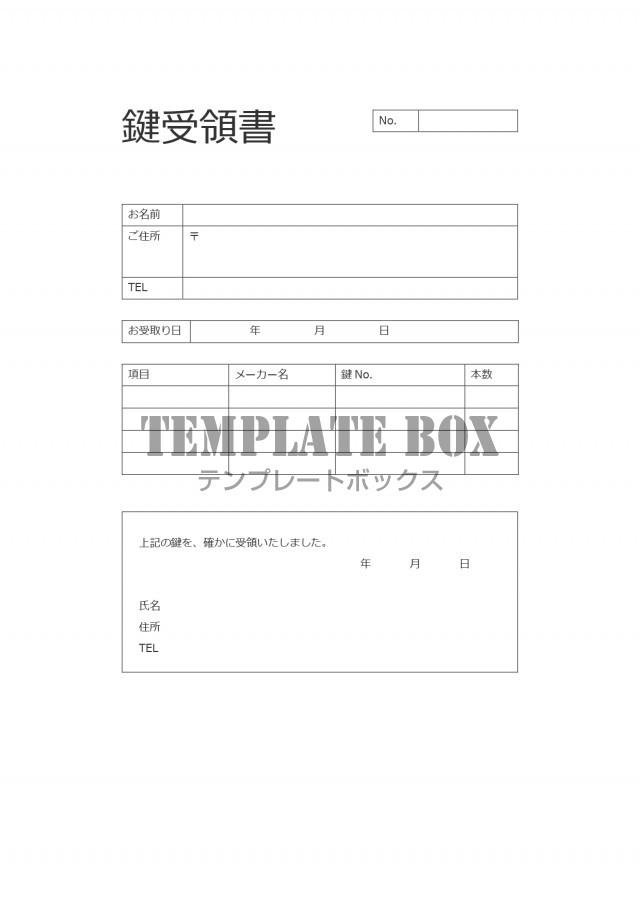 貸し借りや受け取りに使える!鍵受領書「Excel・Word・PDF」名前・住所・連絡先のシンプルなフォーマット無料テンプレートTemplateBox。