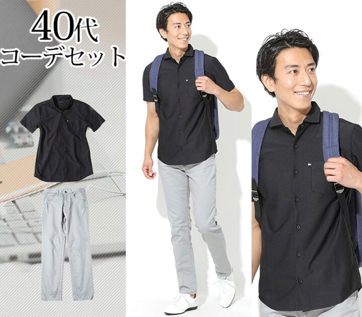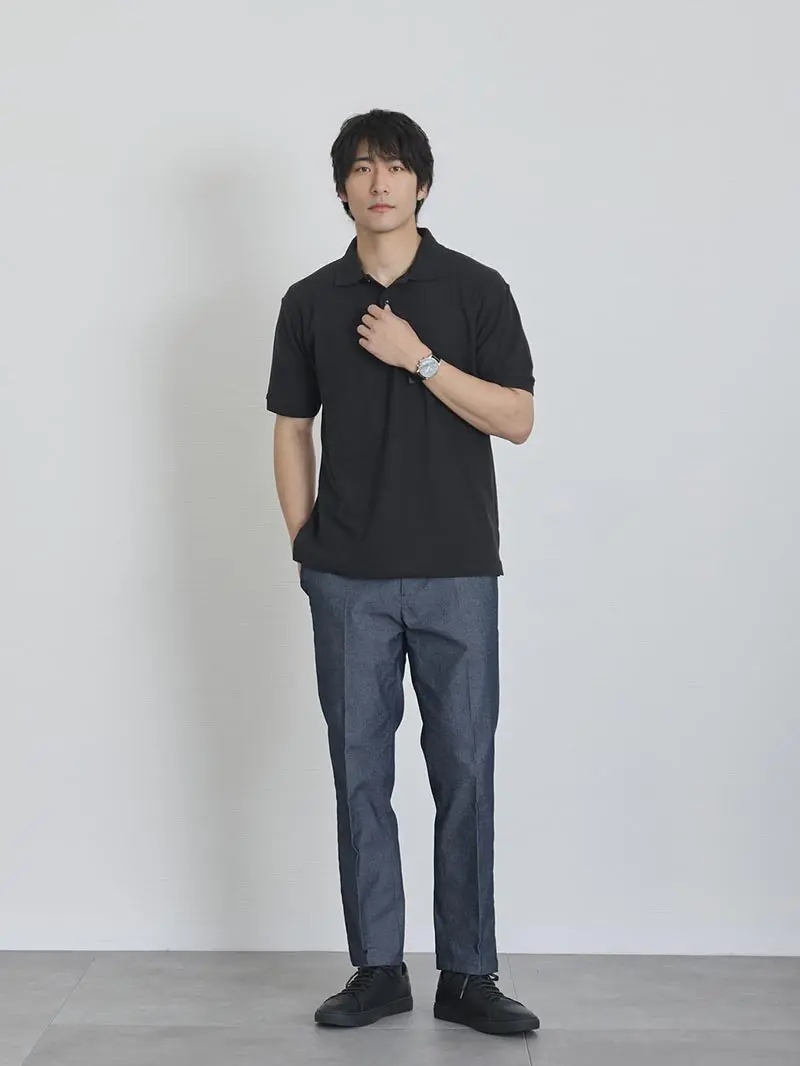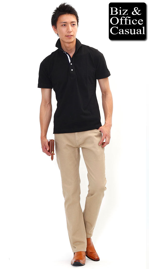 20代 半袖ネイビーポロシャツ×黒チノパン biz23ss0422のコーディネート例ビジネス・オフィス・スマートカジュアル専門通販。