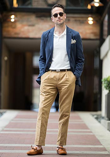 紺ジャケット×白ポロシャツ×チノパン プリーツ の着こなし メンズItaly Web。