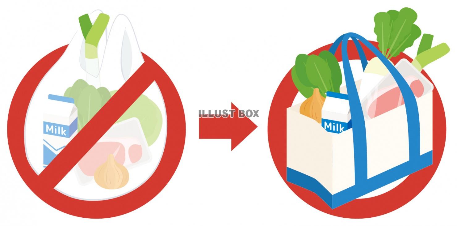 レジ袋からエコバックへ01 レジ袋、ポリ袋、買い物袋、トートバッグ、マイバッグ、:イラスト無料。