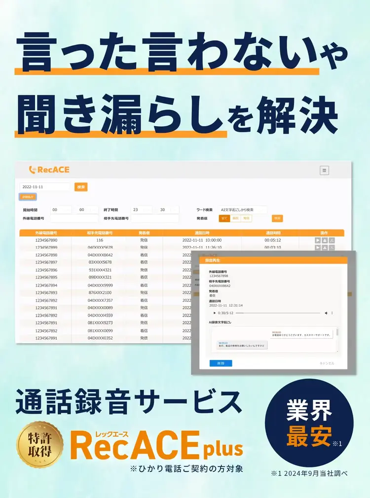 電話の言った言わないを解決!ひかり電話通話録音サービスRecACEplus レックエースプラス。