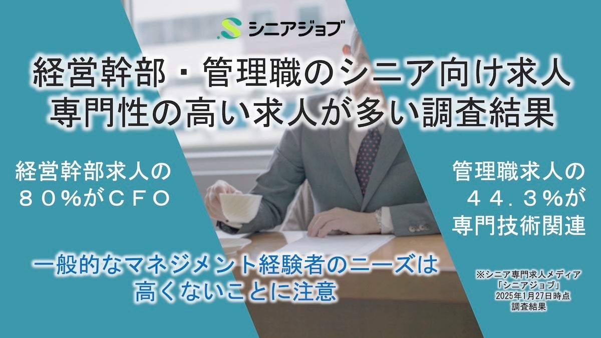 経営幹部と管理職のシニア向け求人では専門性の高い求人が多い調査結果株式会社シニアジョブのプレスリリース。