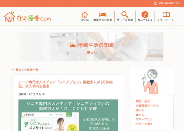 シニア専門求人メディア「シニアジョブ」の掲載求人が1万件を突破したことが在宅療養.comで紹介されました株式会社シニアジョブ。